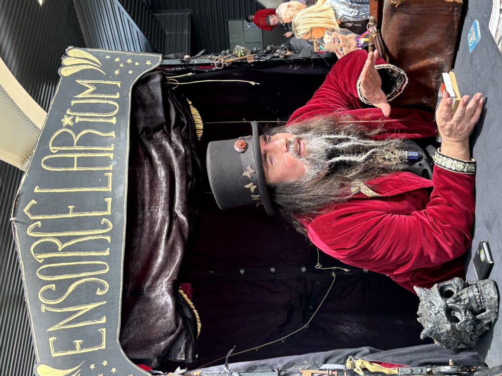 Le professeur Moriboum, cavalcadant à la tête de son étrange engin roulant, lèvera à la demande du premier venant, le voile sur son spectacle ambulant. Alors que la foule se presse autour de lui, il aime dévoiler miracles, merveilles et autres bizarreries. Tours de cartes, mentalisme, télépathie, apparitions, disparitions, transformations…. Tous ces mystères ne s’arrêteront que lorsque le rideau tombera sous vos acclamations.