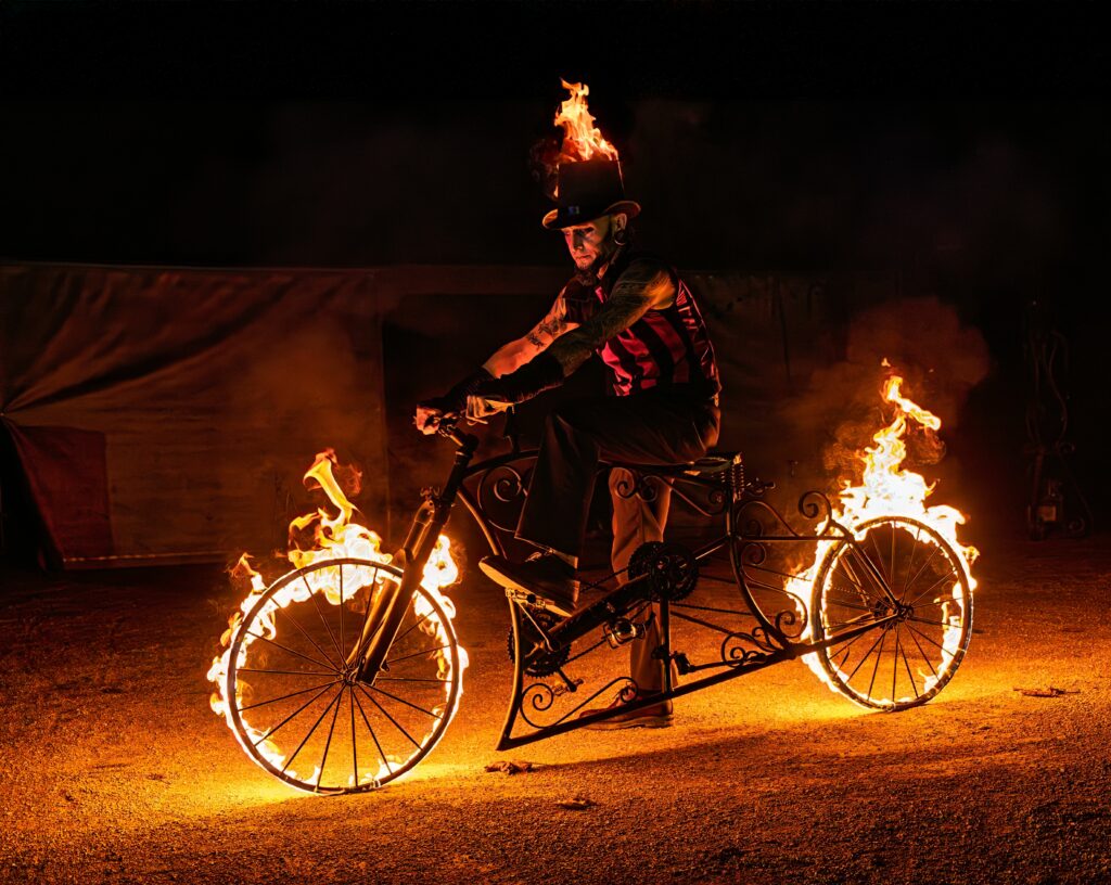 Décidés à embraser la mécanique des pendules, plastronnant sur une bicyclette de fer et de feu, ou encore s’effaçant sous un parapluie bouclier brasier qui protège d’une cascade d’artifices, le duo invite le spectateur à la contemplation de son univers chaleureux et poétique.